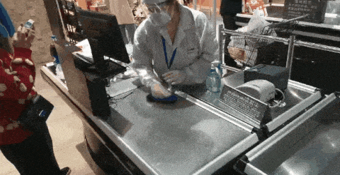 收银台是顾客在超市内的必经之处,为了保证工作人员和顾客的安全,超市让收银员做了充分的防护。